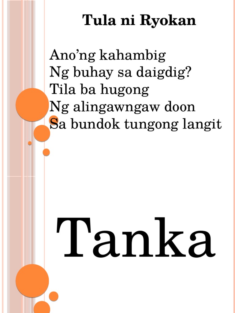 Anyong tula ng mga hapon. Tulad ng sinaunang anyo ng panitikang Filipino nasa anyo ito ng salimbibig o oral at. Examples of tanka tunukol in love.
